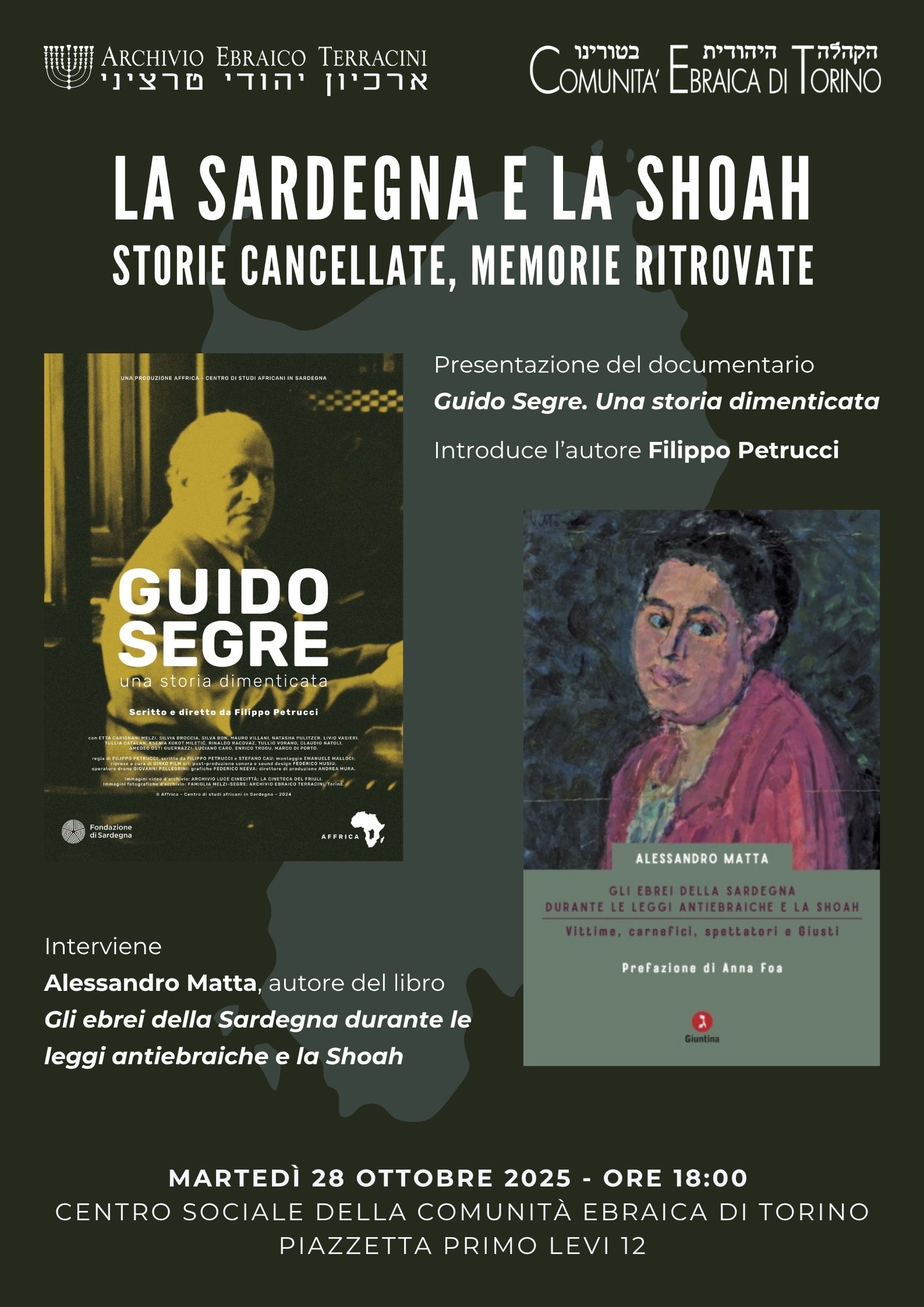 L’evento offre un’occasione per riflettere su questo legame spesso dimenticato, attraverso la proiezione del documentario “Guido Segre – Una storia dimenticata”, a cura di Filippo Petrucci, che include anche materiali provenienti dall’Archivio Ebraico Terracini. Il film è dedicato alla figura di Guido Segre, imprenditore e politico italiano la cui carriera – legata anche alla fondazione della città di Carbonia – fu bruscamente interrotta dalle leggi razziali del 1938.